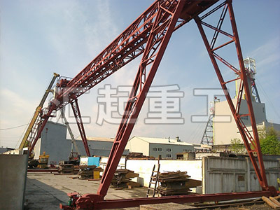 其金屬結(jié)構(gòu)類似門形框架,承載主梁下方安裝兩支支腳,可直接在地面軌道上行走,主梁兩端可外伸懸臂梁。